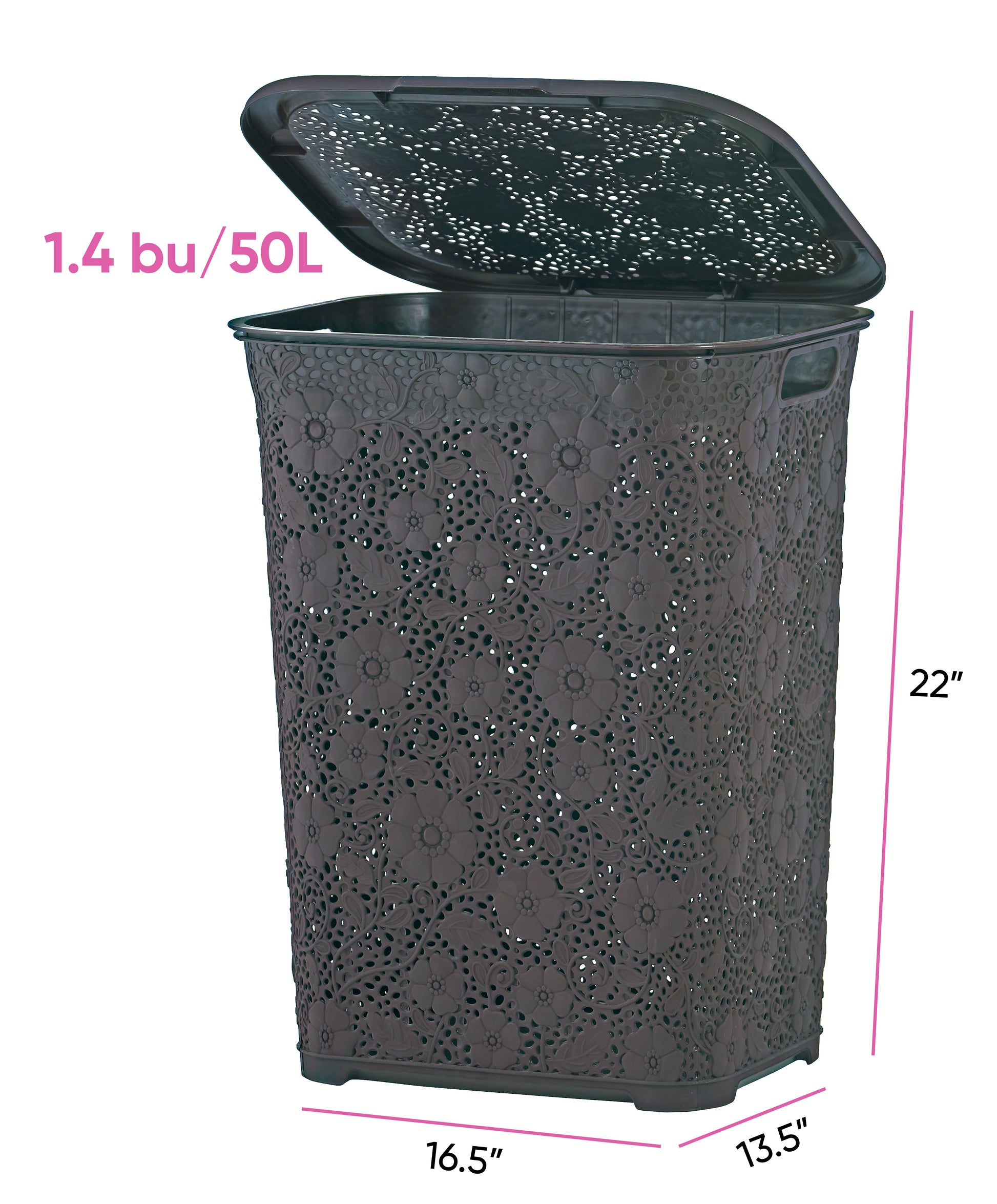This superio 50-liter lace style laundry hamper is designed to store dirty clothes until you wash it, so the room should not look rumpled. You can place it wherever you decide, in the washroom, bathroom, dorm room… the lid is very easy to open but still, it holds tightly onto the hamper. The dimensions are 22” (H), 16.5” (L), 13.5” (W).