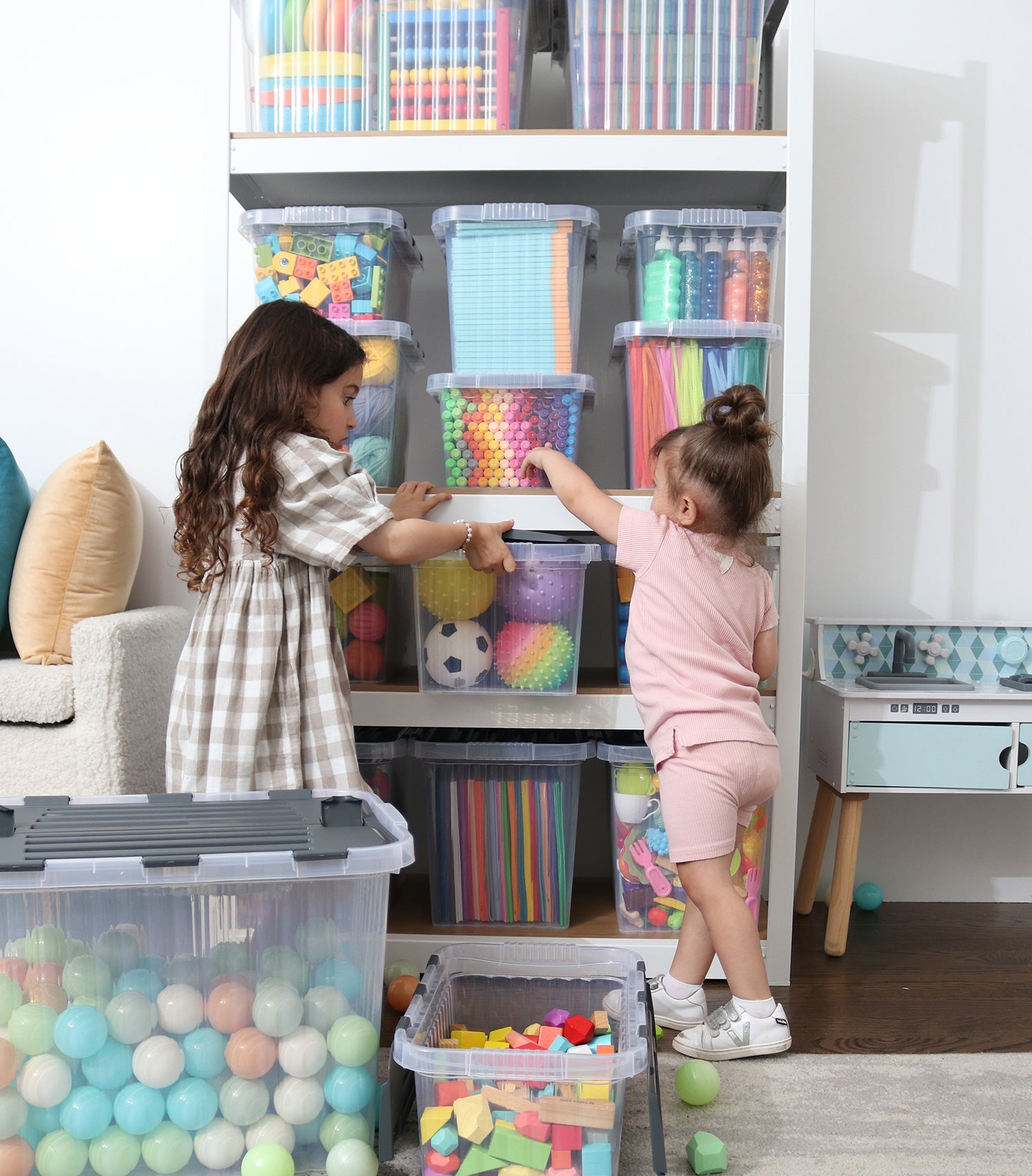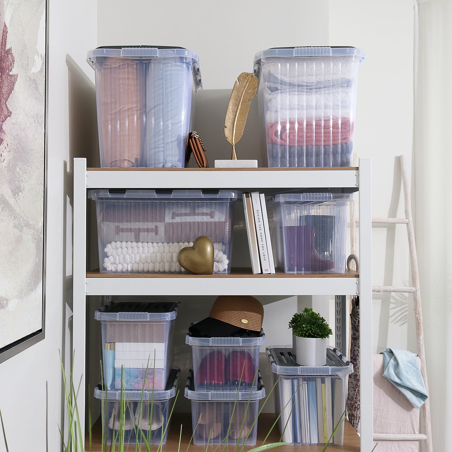 These stackable, space-efficient storage boxes make organizing simple and easy. Use in your basement, garage, boat, camper, and more. Ensure your shoes, food, arts and crafts material, yarns, or toys remain dust-free and clean with this handy container box. See-through base for easy identification of contents. Snap-tight lid keeps contents secure.