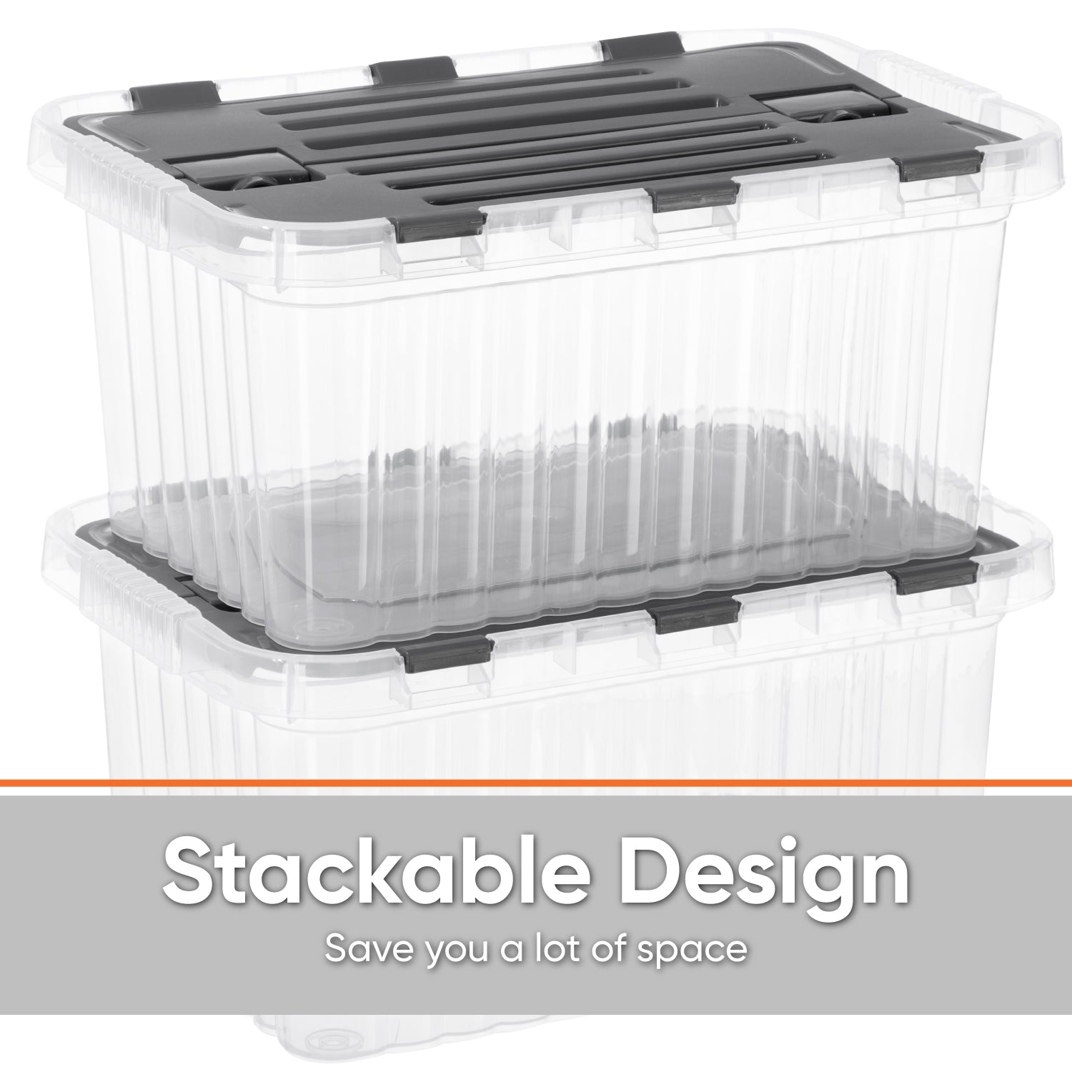 These stackable, space-efficient storage boxes make organizing simple and easy. Use in your basement, garage, boat, camper, and more. Ensure your shoes, food, arts and crafts material, yarns, or toys remain dust-free and clean with this handy container box. See-through base for easy identification of contents. Snap-tight lid keeps contents secure.
