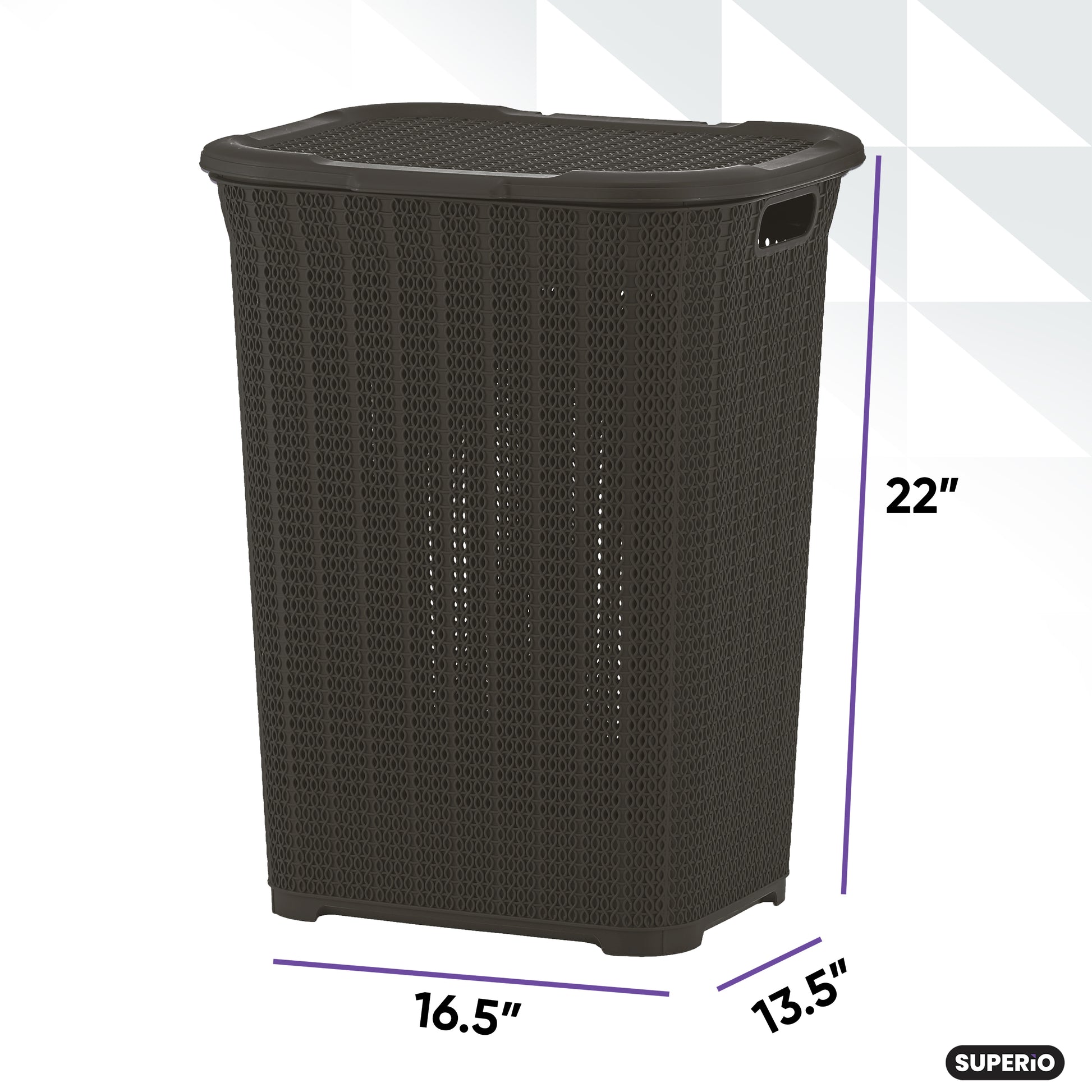 This superio 50-liter knit-style laundry hamper is designed to store dirty clothes until you wash them, so the room should not look rumpled. You can place it wherever you decide, in the washroom, bathroom, or dorm room… the lid is very easy to open but still holds tightly onto the hamper. The dimensions are 22” (H), 16.5” (L), 13.5” (W).