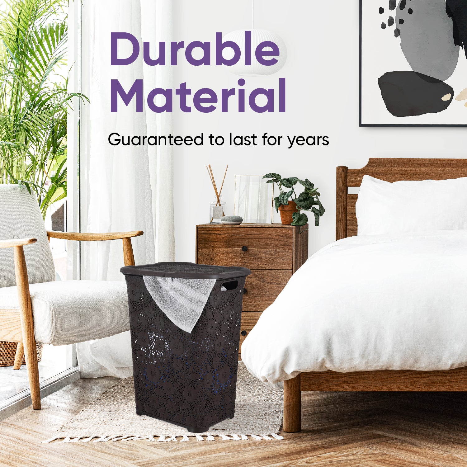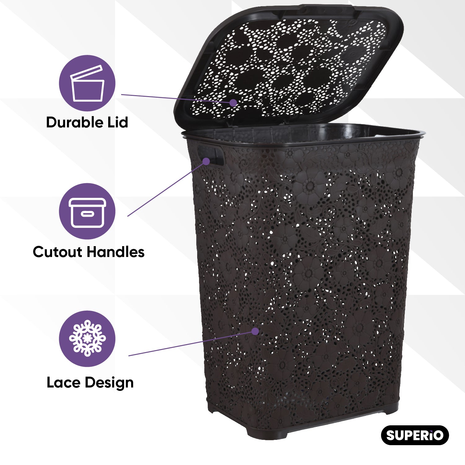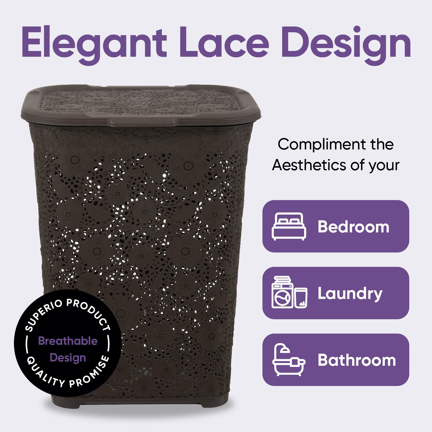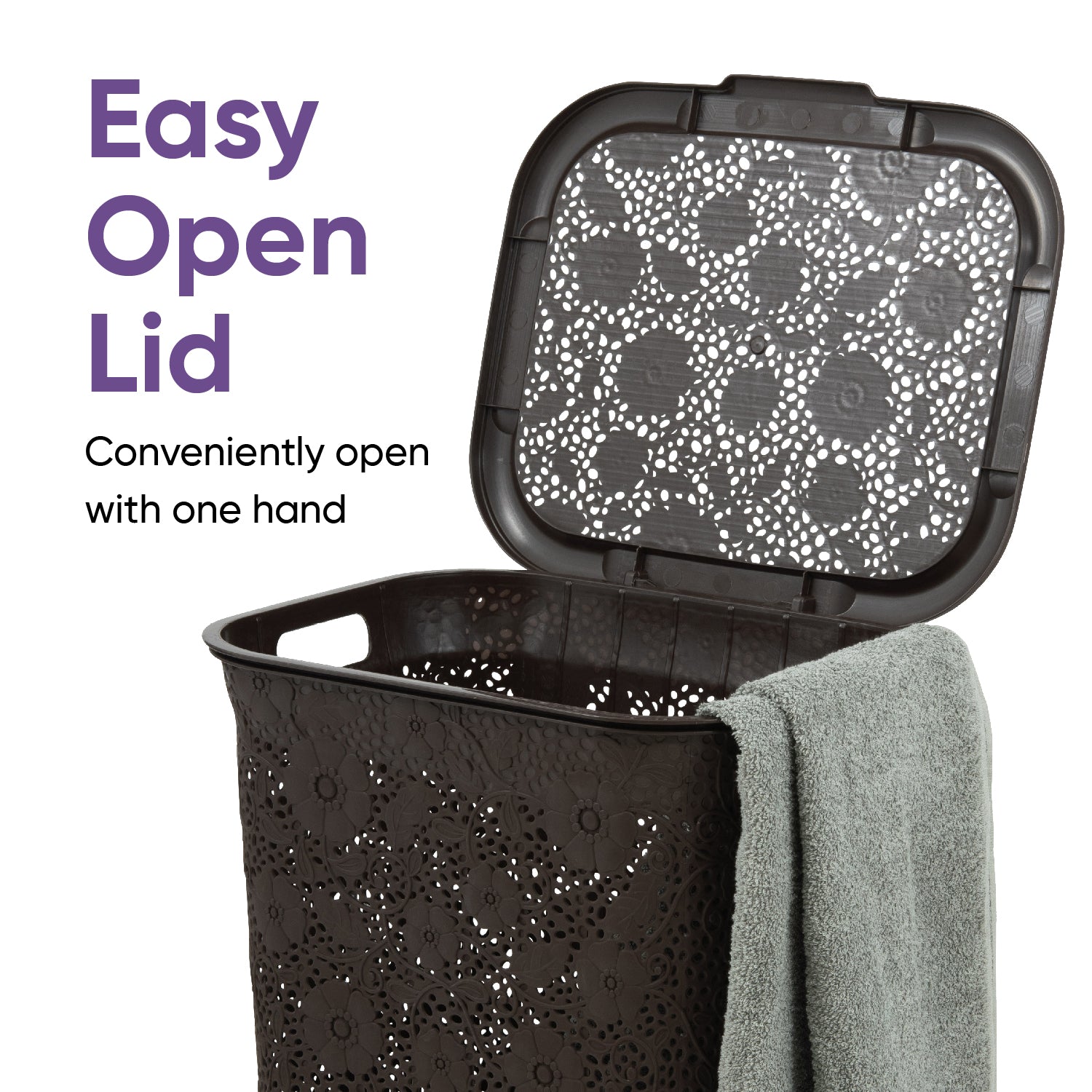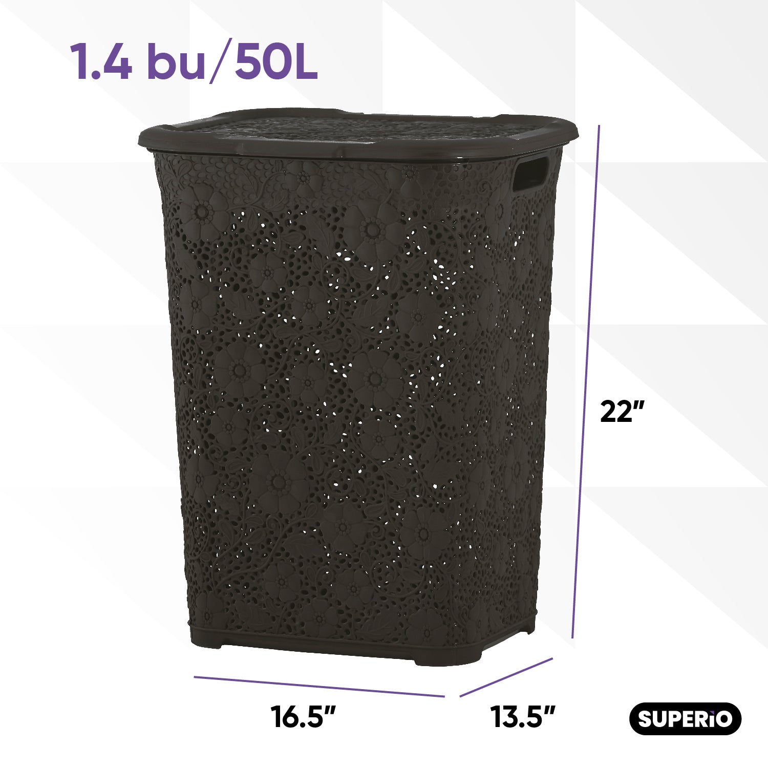 This superio 50-liter knit style laundry hamper is designed to store dirty clothes until you wash it, so the room should not look rumpled. You can place it wherever you decide, in the washroom, bathroom, dorm room… the lid is very easy to open but still, it holds tightly onto the hamper. The dimensions are 22” (H), 16.5” (L), 13.5” (W).
