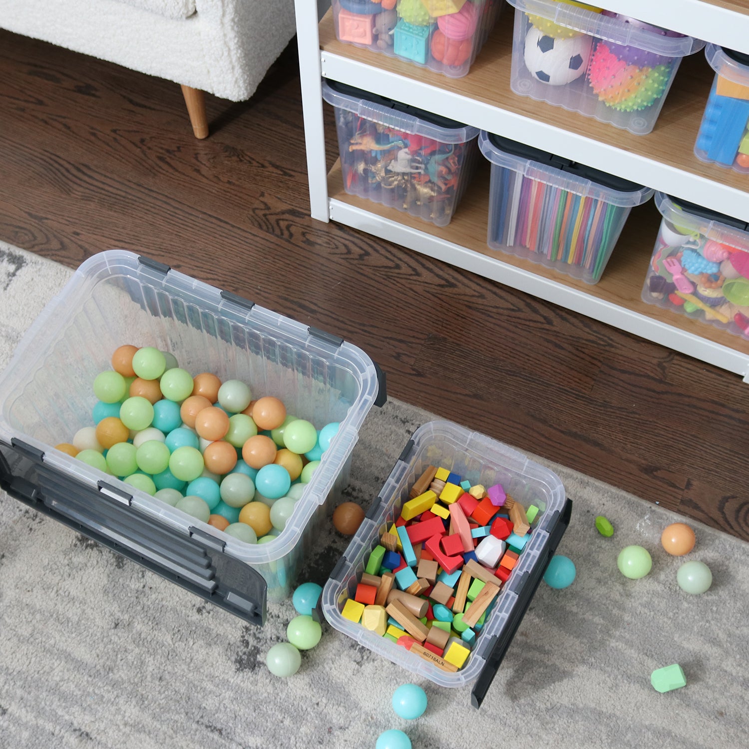 These stackable, space-efficient storage boxes make organizing simple and easy. Use in your basement, garage, boat, camper, and more. Ensure your shoes, food, arts and crafts material, yarns, or toys remain dust-free and clean with this handy container box. See-through base for easy identification of contents. Snap-tight lid keeps contents secure.