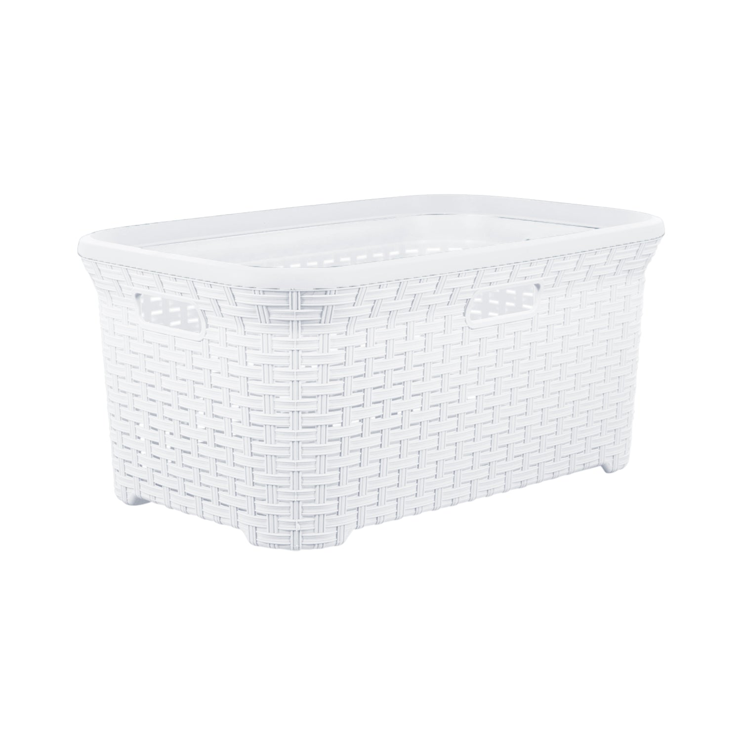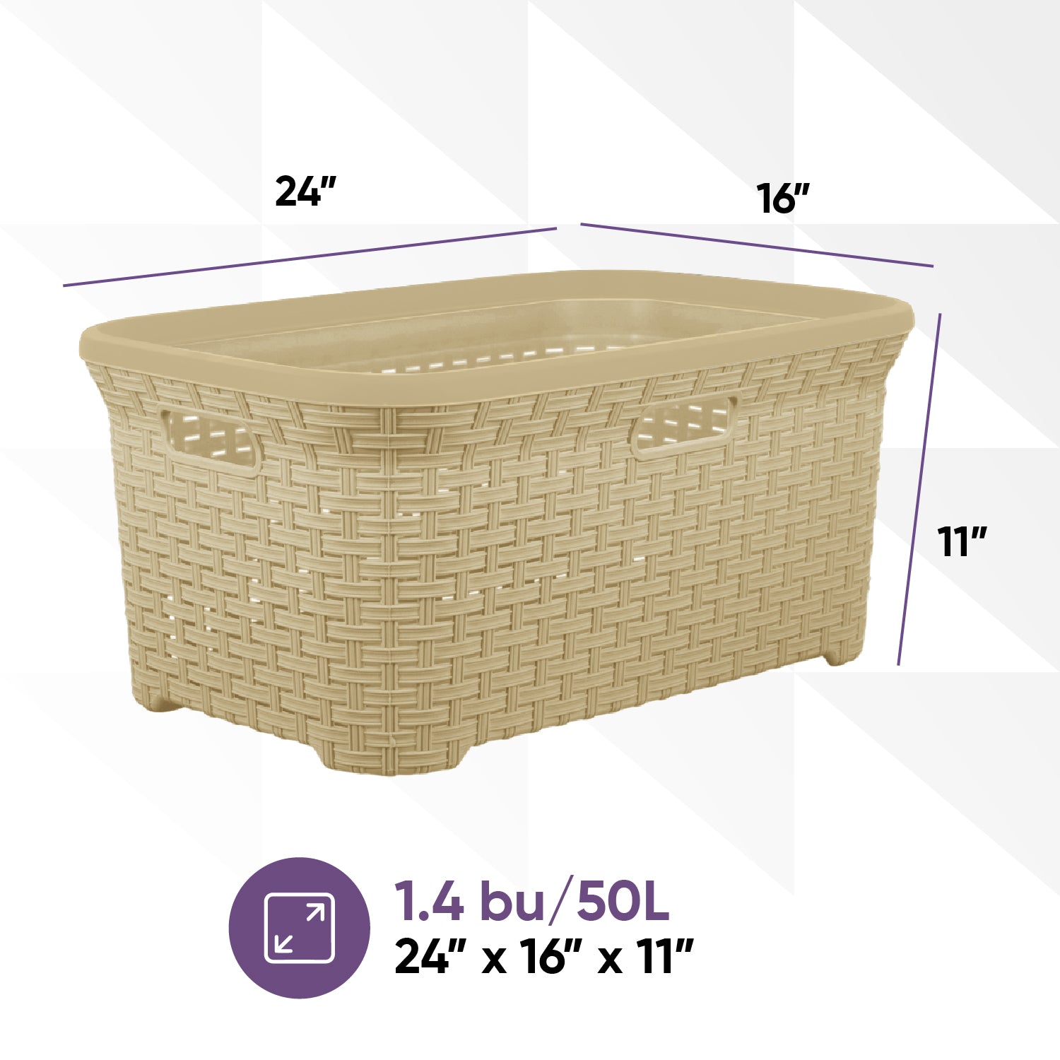 This superio 50-liter wicker style laundry basket is made to store laundry or anything else you decide. It is high-quality durable plastic and has a smooth finished trim and interior preventing from snagging delicate items. The dimensions are 10.25” (H), 15.75” (W), 24” (L).