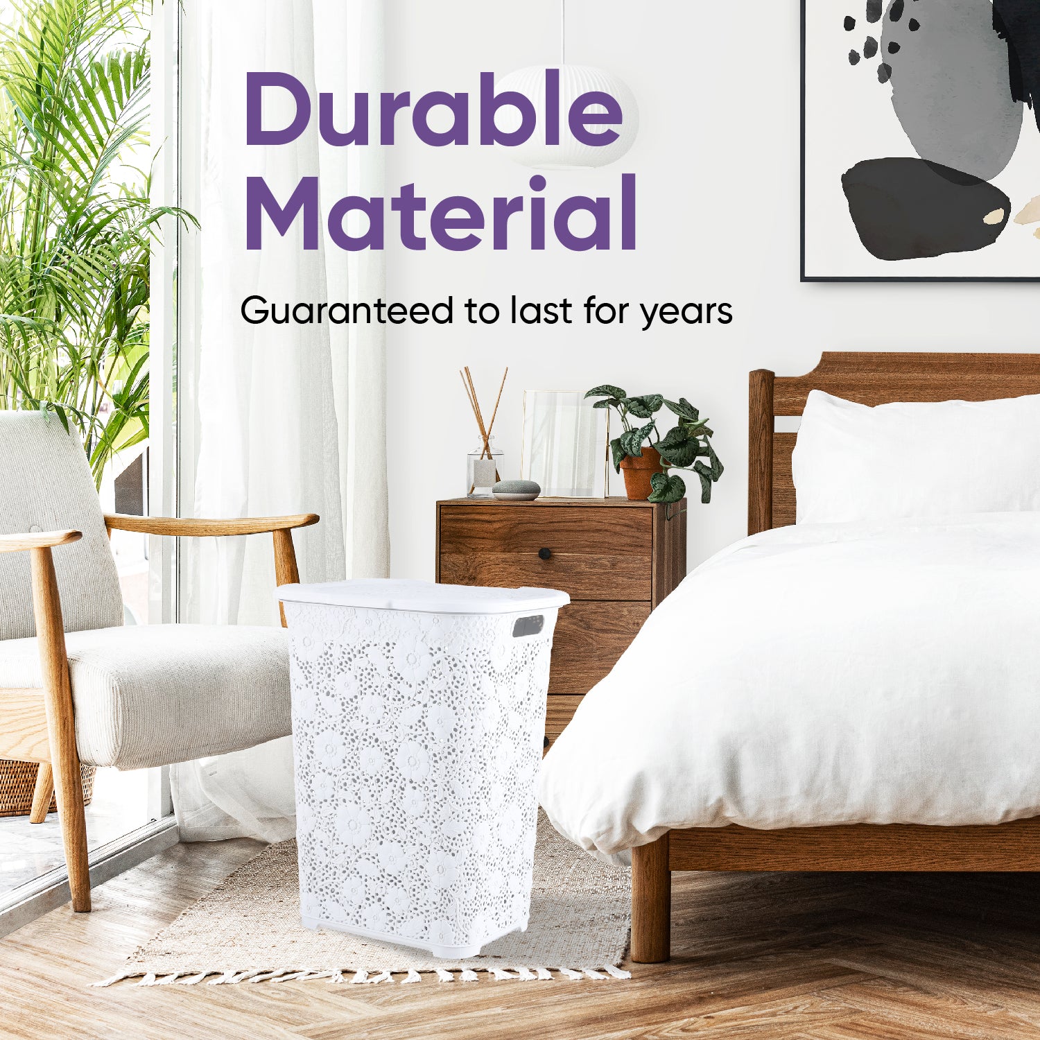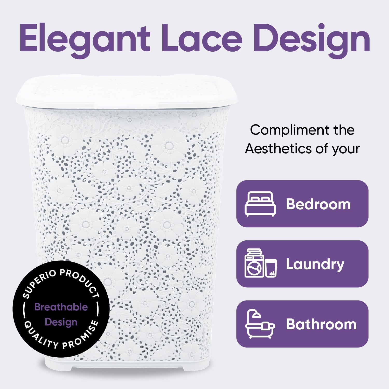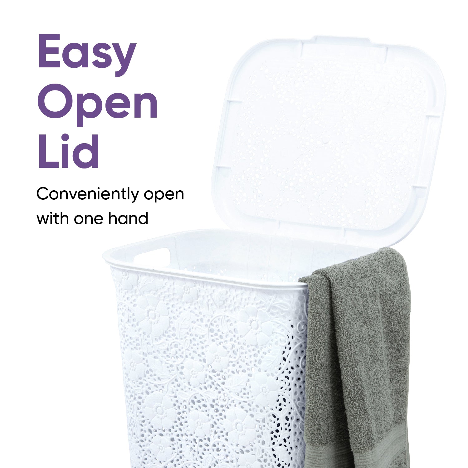 This superio 50-liter lace style laundry hamper is designed to store dirty clothes until you wash it, so the room should not look rumpled. You can place it wherever you decide, in the washroom, bathroom, dorm room… the lid is very easy to open but still, it holds tightly onto the hamper. The dimensions are 22” (H), 16.5” (L), 13.5” (W).