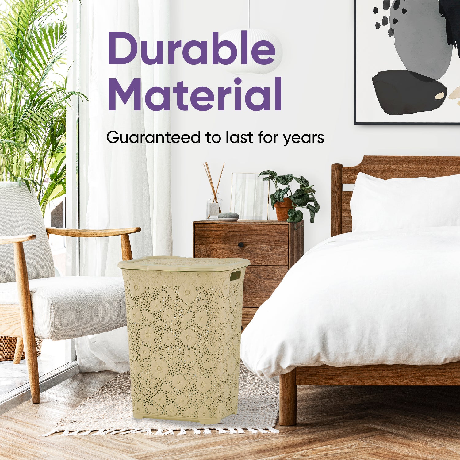 This superio 50-liter lace style laundry hamper is designed to store dirty clothes until you wash it, so the room should not look rumpled. You can place it wherever you decide, in the washroom, bathroom, dorm room… the lid is very easy to open but still, it holds tightly onto the hamper. The dimensions are 22” (H), 16.5” (L), 13.5” (W).