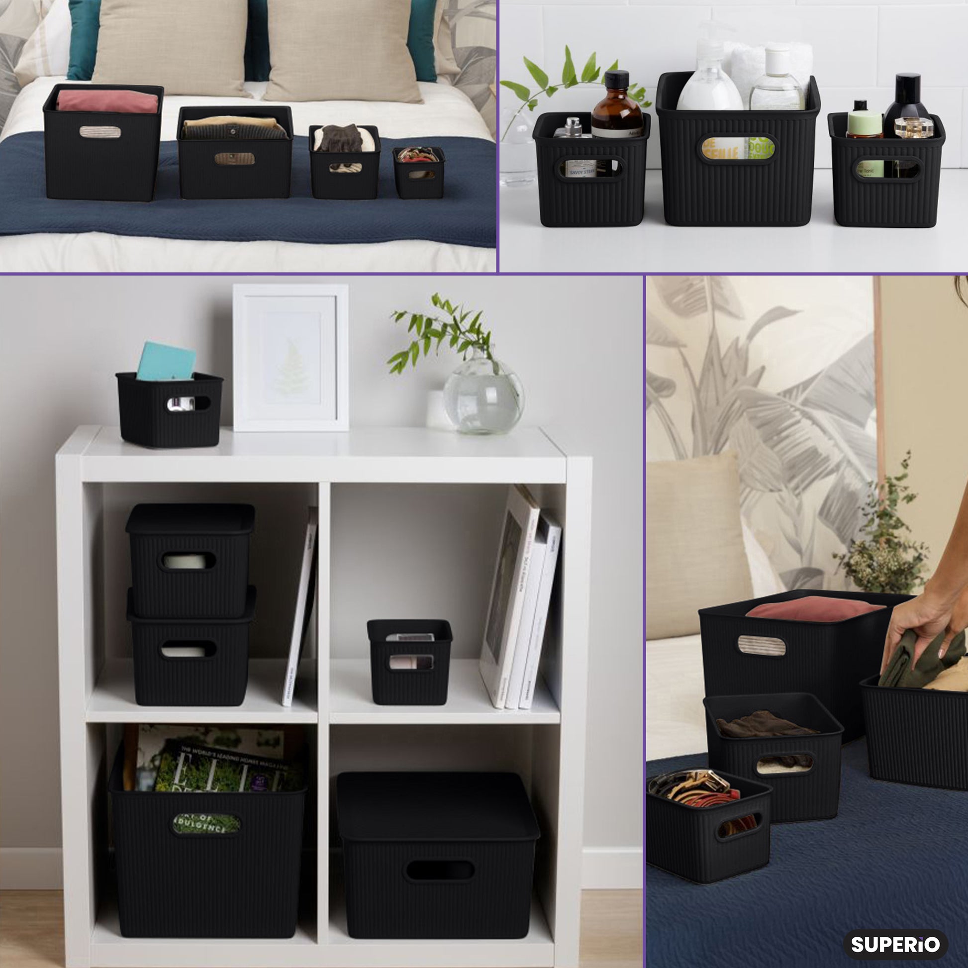 - These stackable plastic storage baskets create a professional look while providing practical organization in your living spaces.