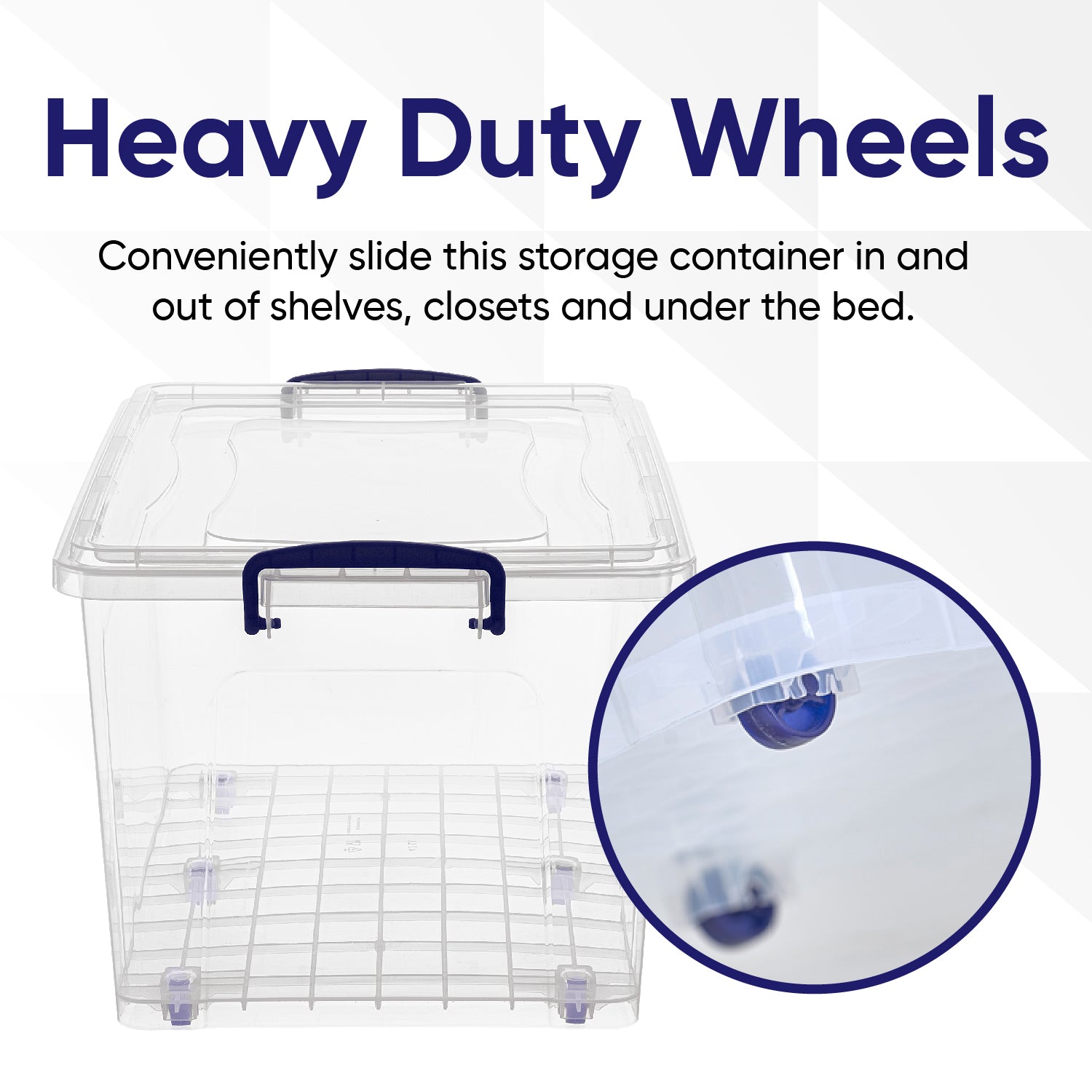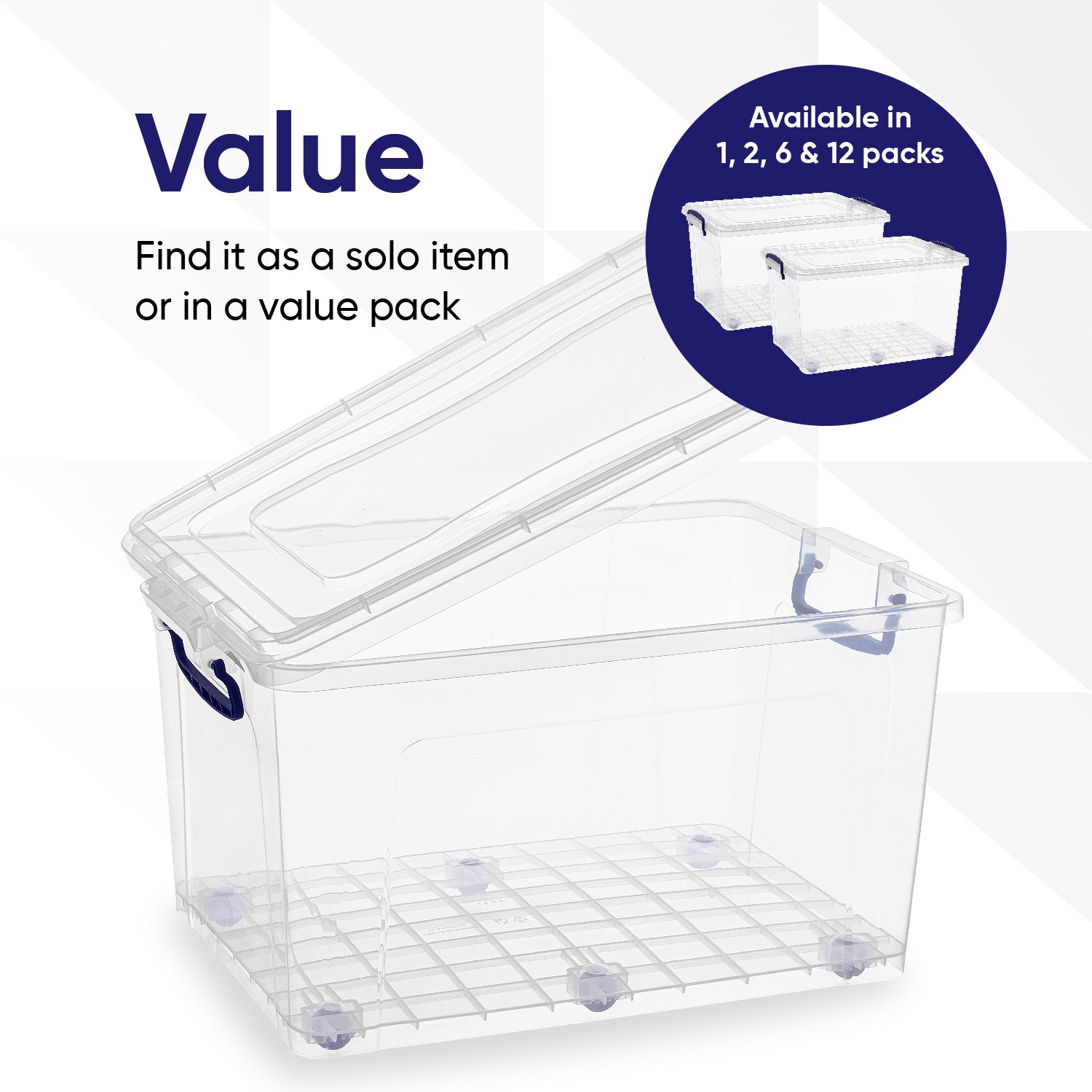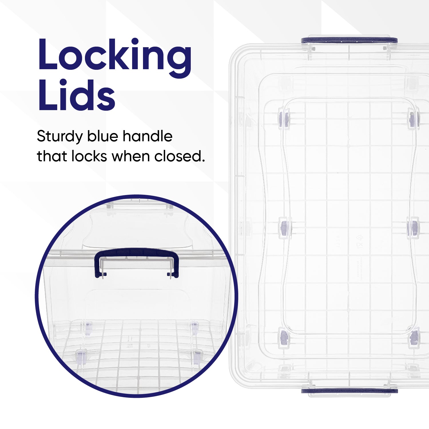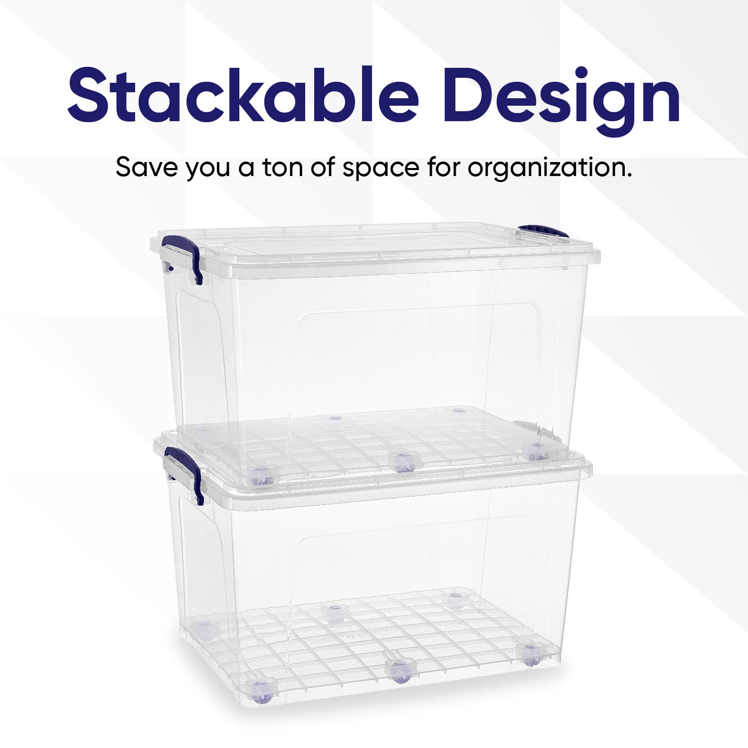 These stackable, space-efficient storage boxes make organizing simple and easy. Use in your basement, garage, boat, camper, and more. Ensure your shoes, food, arts and crafts material, yarns, or toys remain dust-free and clean with this handy container box. See-through base for easy identification of contents. Snap-tight lid keeps contents secure.