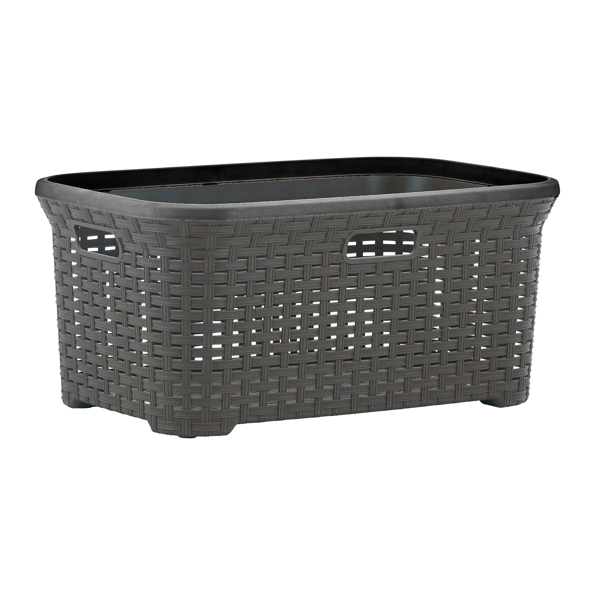This superio 50-liter wicker style laundry basket is made to store laundry or anything else you decide. It is high-quality durable plastic and has a smooth finished trim and interior preventing from snagging delicate items. The dimensions are 10.25” (H), 15.75” (W), 24” (L).