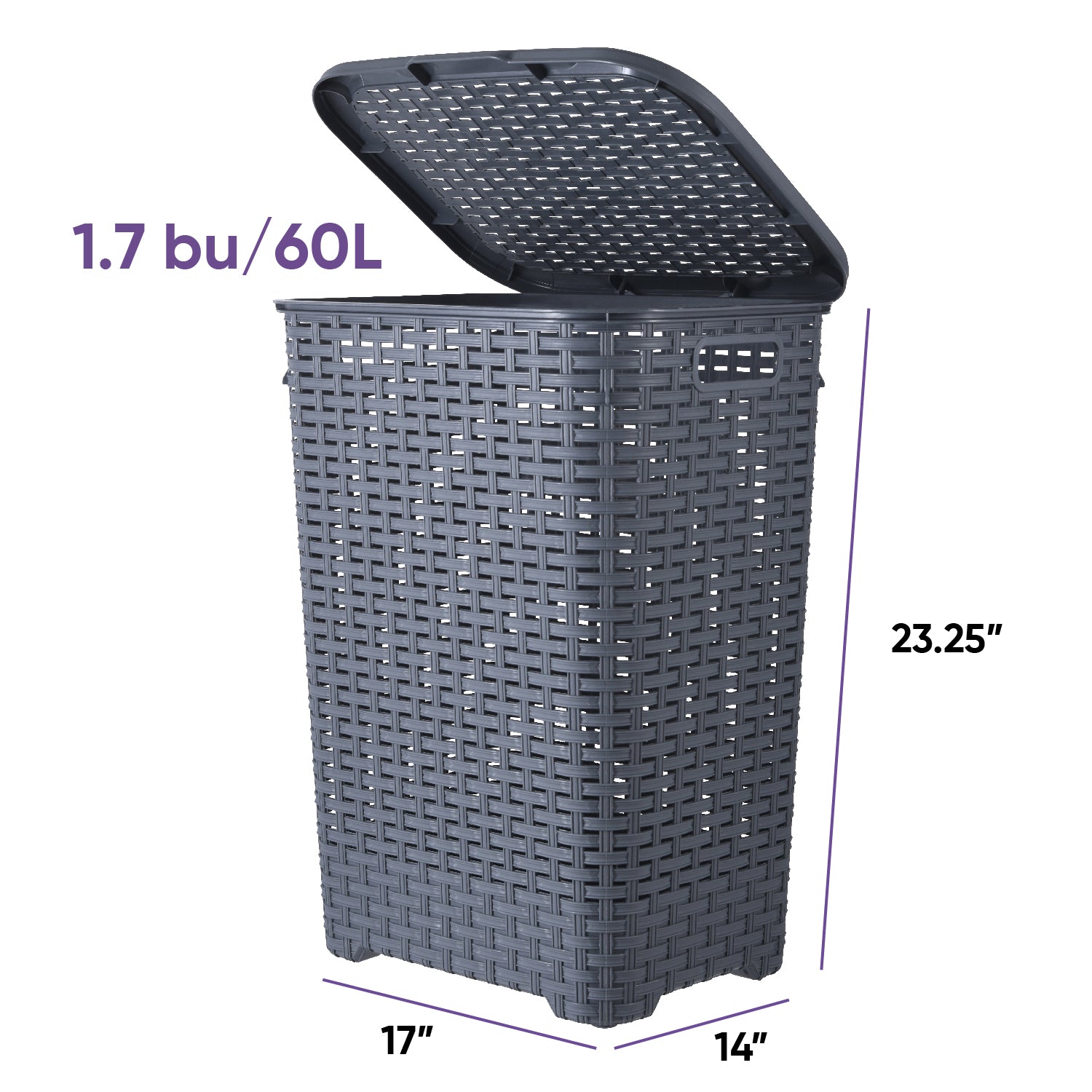 This superio large 60-liter deluxe wicker style laundry hamper is designed to store dirty clothes until you wash them, so the room should not look rumpled. You can place it wherever you decide, in the washroom, bathroom, dorm room… the lid is very easy to open but still, it holds tightly onto the hamper. The dimensions are 17” (L), 14” (W), and 23.25” (H).