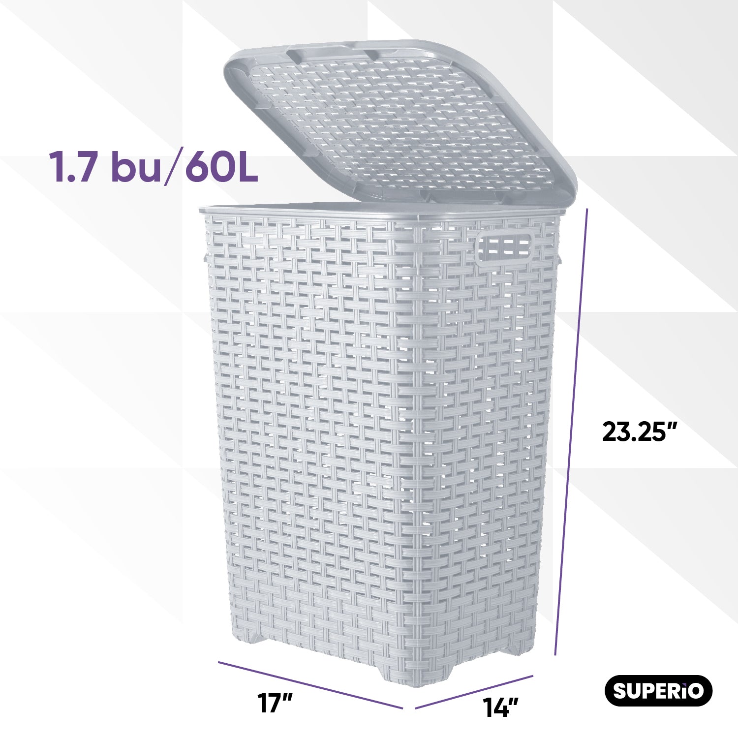 This superio large 60-liter deluxe wicker-style laundry hamper is designed to store dirty clothes until you wash it, so the room should not look rumpled. You can place it wherever you decide, in the washroom, bathroom, dorm room… the lid is very easy to open but still, it holds tightly onto the hamper. The dimensions are: 17” (L), 14” (W), 23.25” (H).